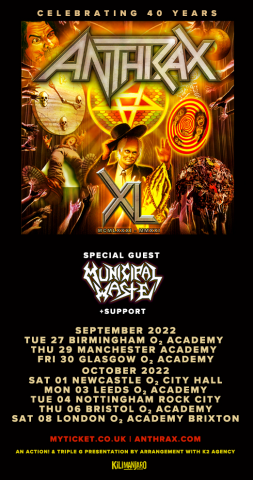 Anthrax are coming to the UK for a eight day headline run, in celebration of their 40th anniversary. Main support on these dates will come from Thrash Metal / Speed Metal / Punks Municipal Waste. This is your chance to see Metal legends play through their hits, for the first time since the Covid lockdowns. Anthrax's 40th anniversary, during which time the band released eleven studio albums, was awarded multiple Gold and Platinum certifications, received six Grammy nominations, and a host of other accolades from the media, the music industry, and fans. In 1991, the band helped break down race and genre barriers when they collaborated with Public Enemy on the track 'Bring the Noise', and was the first Metal band to have its music heard on Mars when NASA played 'Got the Time' to wake up the Mars Rover in 2012.