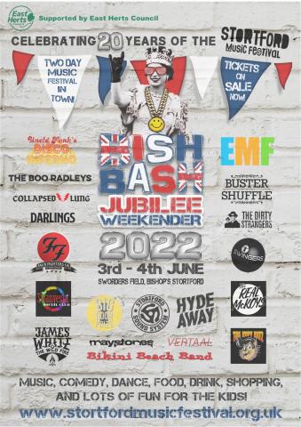 Remember the festival this year is on the extended Jubilee weekend on Friday 3rd of June and Saturday 4th of June. Tickets are already selling heavily, so book ahead and don’t miss out!. Also, keep an eye out for fund-raising events leading up to the festival, all details can be found on Stortford Music Festival Facebook page. Join the party early as always, Bish Bash benefits from business community sponsors, so if you’re a local company and would like the opportunity to promote yourselves, support the community and be part of all the fun, please get in touch: Sponsorship@StortfordMusicFestival.org.uk