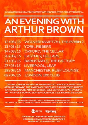 Taking a break from live shows with ‘The Crazy World of Arthur Brown’, the amazingly operatic progressive artiste extraordinaire Arthur Brown will be touring ‘An Evening With’ style show to seated audiences telling his life story in March 2015.