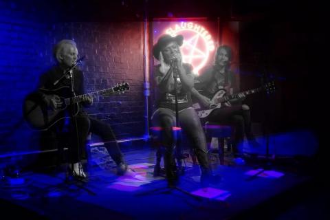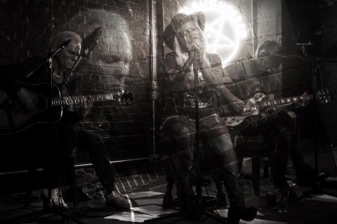 The imagery Lux conjures boasts a nod to the glamour of 1940's Hollywood cinema, but tonight Lux is cast as Alfred Hitchcock’s blonde leading lady: misunderstood and always underestimated. This is a rare live performance of a wayward girl searching for paradise in a heartless city. Red light washes over the intimate basement room as Lux, former Sister Witch conspirator David Ryder-Prangley (Rachel Stamp) and guitarist Alexander Anthony (Callimico / Gold Baby), take their seats beneath the glowing pentagram (a clear homage to the 1981 film ‘An American Werewolf In London’).