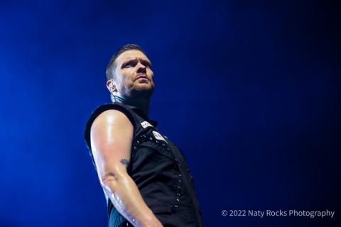 The first song in the band’s set tonight is 'Saints of Violence and Innuendo' which is a brand-new song off the album 'Planet Zero' which is due to be released on July 1st. I am not the only person that can't wait to hear and buy this record after hearing the first three songs live. The band have grown from strength to strength over the lockdown period and are not afraid to try new things. Like the intensity of this track which is powerful in every way, Brent's face shows up this intensity and he also shows this with his movements around the stage. He uses poses to emphasize the feeling of the song and it comes across in a powerful way. His attitude is also enhanced by the crowd screaming with excitement which gives him more power and energy to deliver the song.