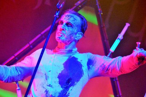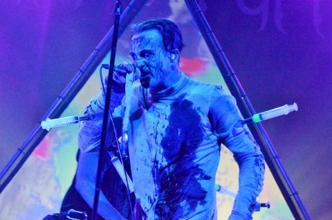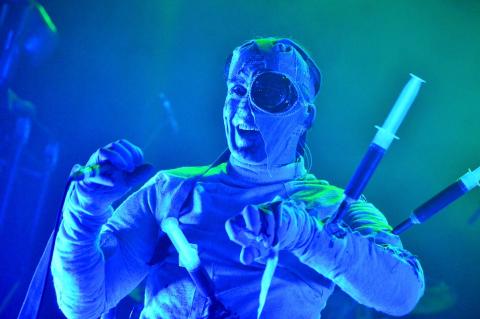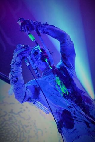Hoping not to be discovered. Before being stripped of the garments and breaking into the first number in the set. Skinny Puppy really are the bridge between art and music and are mesmerizing to watch. From weird creatures to turning almost into a syringe voodoo doll. They have a frontman who is really not scared of saying his views or what he is feeling.